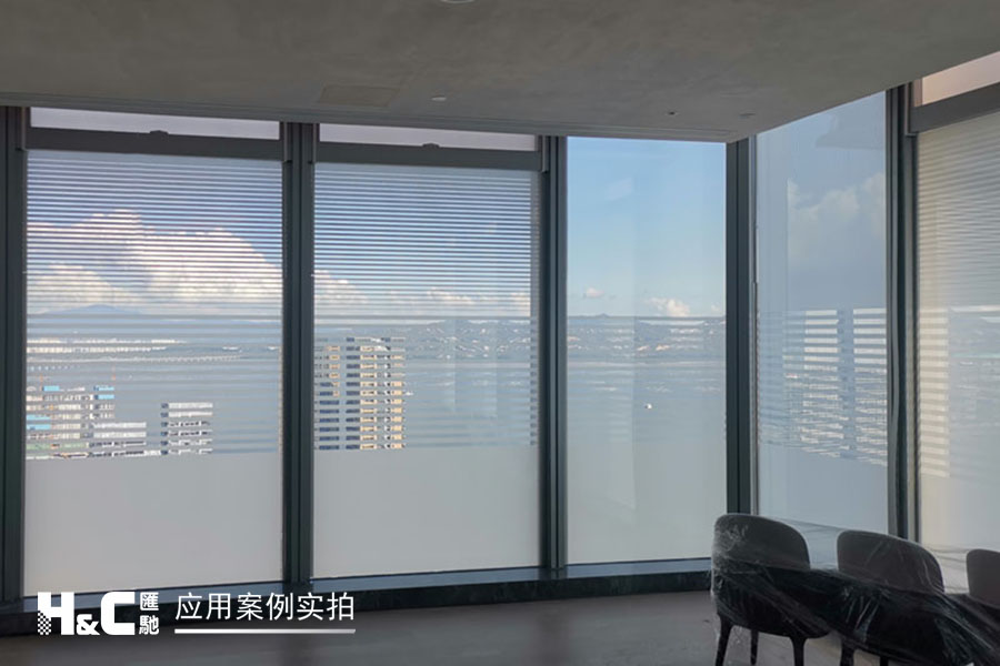 外立面的玻璃采光極好,但有時室外復雜的光線也會對室內造成困擾。本案業主采用了廣州匯馳實業提供的百葉調光膜,貼在玻璃內表面,讓普通玻璃變成調光玻璃。百葉的變化效果可以用遙控調控,有效控制光線的進入,讓玻璃變得更有科技感。