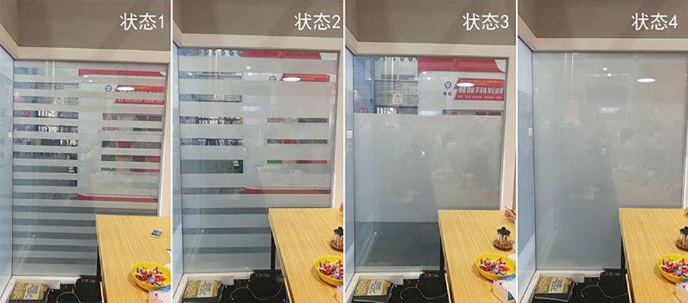 隱形電子百葉玻璃是分區調光玻璃的一種常見應用。乍看之下,它與普通玻璃無異,但通電后可控制顯示百葉窗一般的動態變化效果,且通過遙控器就能轉換效果。