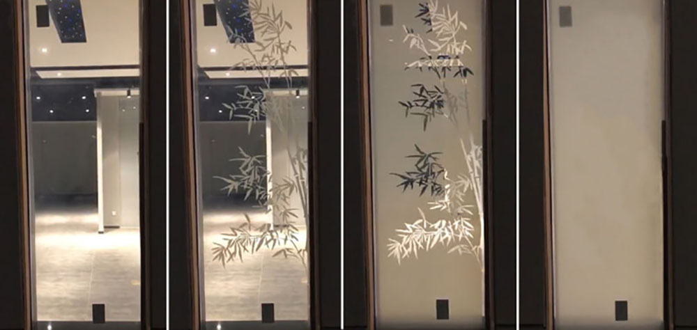 分區,是通過技術手段,把調光玻璃中的液晶膜分成若干個獨立的、不交織的片區,讓液晶膜“分而不斷”,從而實現對每個片區通斷電的單獨控制,讓玻璃顯示透明或霧化效果的圖案,這就是分區調光玻璃。